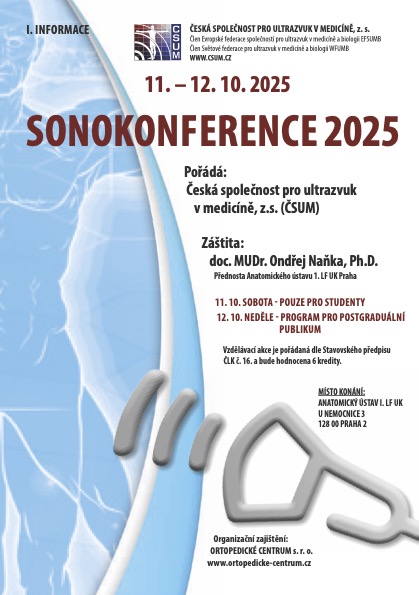 Jménem výboru České společnosti pro ultrazvuk v medicíně, z.s. (ČSUM), která se již více než 50 let snaží o rozvoj sonografie a propojování jejích odborníků v naší zemi, bych Vás touto formou, stejně jako v letech předchozích, rád pozval k účasti na naší sonokonferenci. Sonokonference 2025 se bude konat ve dnech 11.-12.10.2025 v prostorách Anatomického ústavu 1. lékařské fakulty Univerzity Kalovy v Praze. Její odborný program, který je přílohou tohoto e-mailu, je rozdělen na část určenou studentům lékařských fakult (sobotní program) a část určenou lékařům a dalším již graduovaným zdravotníkům (nedělní program).